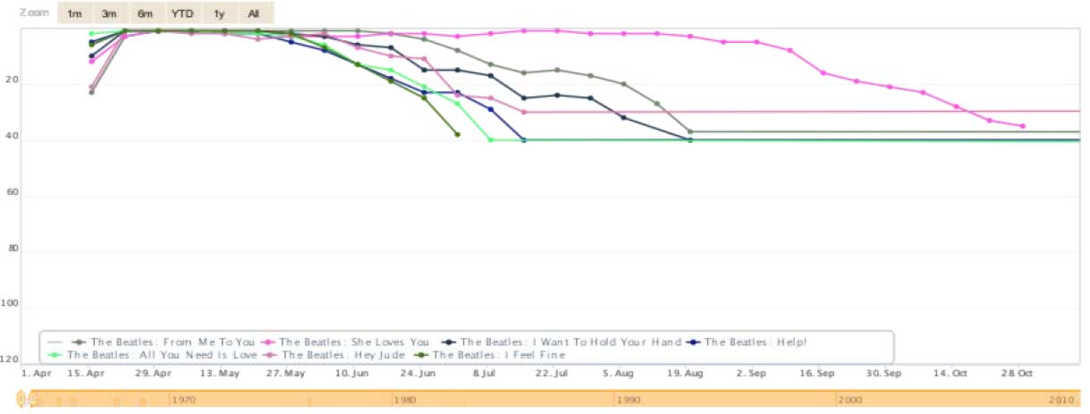 The #3 song of the sixties in GB belongs to crooner Ken Dodd, whose recording of “Tears” (a song originally written in 1929) was the #1 song of 1965. As the graph shows, “Tears” (shown in dark blue) was in the charts longer than any Beatles song, save for “She Loves You”. A quick search in MusicID reveals that Ken Dodd never charted outside of GB, but he had fourteen hit singles during the sixties, of which only “Tears” reached #1. Yet that lone #1 sold better than 88.2% of the Beatles’ hits in GB. The graph above also provides a few insights into the correlation between weeks in a chart, weeks at #1, and total sales. Chart positions are determined by consumer sales, so one expects a strong correlation between weeks at #1 (or weeks in the chart) and higher sales. “She Loves You” and “Tears” demonstrate that this is often true. “She Loves You” was the #1 song of 1963, even though 34.5% of its chart life was in 1964. Graphing its chart history shows clearly that it performed better in 1963 than in 1964.